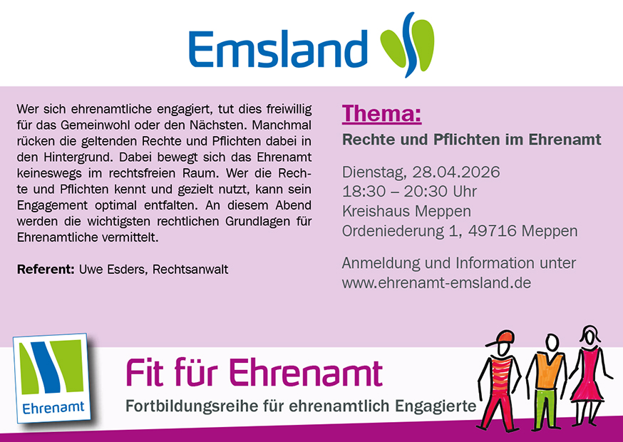 Der Landkreis Emsland bietet zweimal jährlich kostenlos zur Unterstützung und Qualifizierung des Ehrenamtes die Fortbildungsreihe „Fit für Ehrenamt“ an, die sich speziell an die Aktiven in den zahlreichen Vereinen, Verbänden und Organisationen richtet.