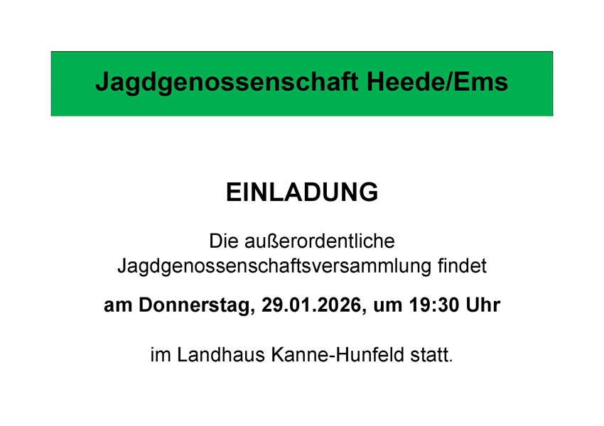 Die Jagdgenossenschaft Heede lädt zur außerordentlichen Generalversammlung am Donnerstag, 29. Januar 2026, um 19:30 Uhr in das Landhaus Kanne-Hunfeld, Am Markt 2, 26892 Heede ein.