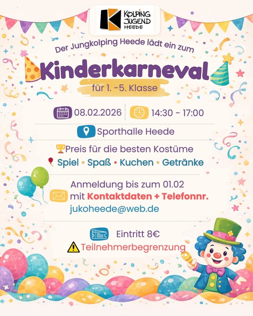 Der Jungkolping Heede lädt zum Kinderkarneval für die 1. - 5. Klasse am Sonntag, 08.02.2026, von 14:30 Uhr bis 17:00 Uhr in die Sporthalle Heede ein.
