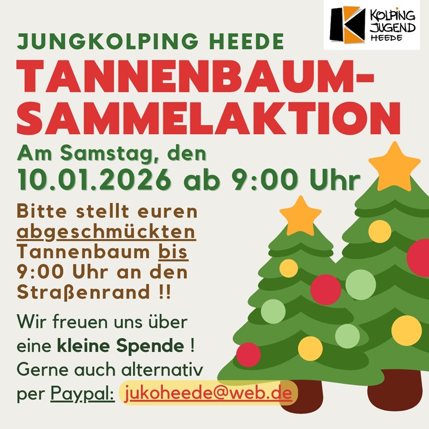 Der Jungkolping Heede sammelt am 10.01.2026 ab 09:00 Uhr die abgeschmückten Tannenbäume ein. Spenden werden gerne auch alternativ per Paypal: