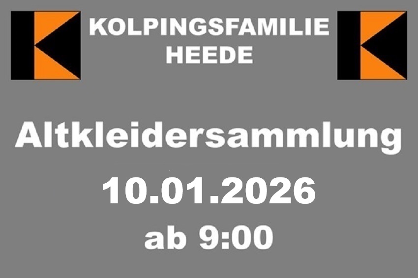 Altkleidersammlung der Kolpingsfamilie Heede am Samstag, 10.01.2026 ab 09:00 Uhr. Bitte die Altkleider an diesem Tag gut verpackt bis 09:00 Uhr an den Straßenrand stellen.
