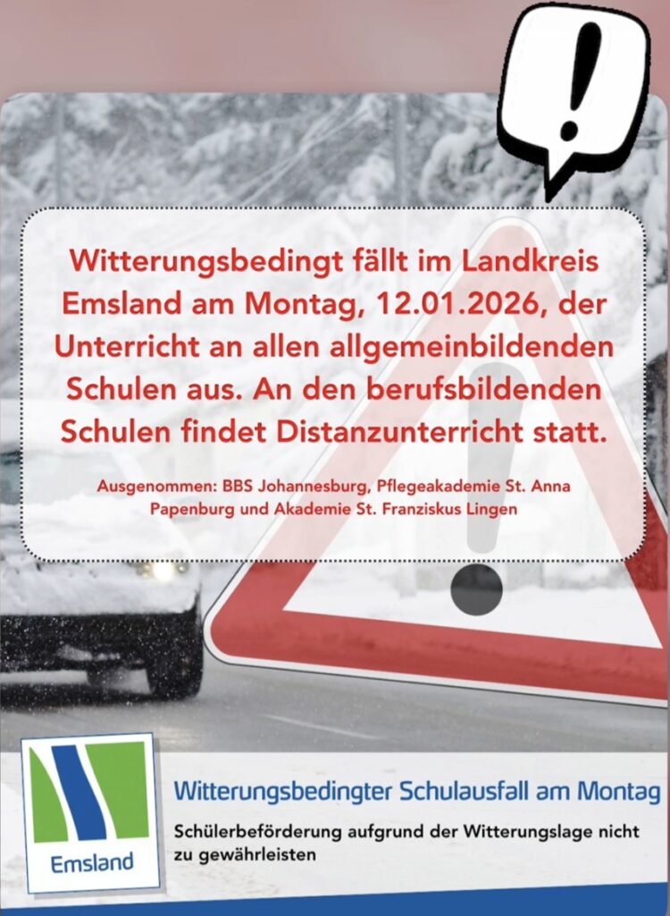 Der Unterricht an allen allgemeinbildenden Schulen in der Grafschaft Bentheim und im Landkreis Emsland fällt am Freitag, 23.01.2026, aus. Ausgenommen sind die BBS Johannesburg und die Akademie St. Franziskus Lingen.