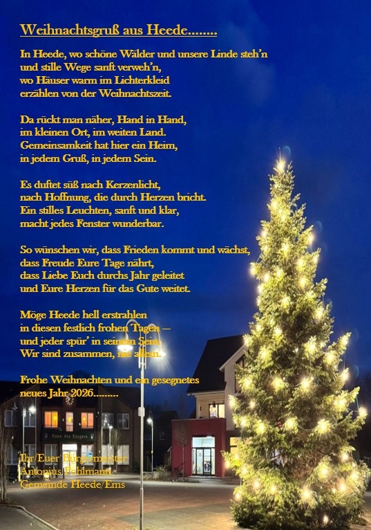 Im Namen des gesamten Rates der Gemeinde Heede wünschen wir Ihnen eine schöne restliche adventliche Zeit, ein frohes und gesegnetes Weihnachtsfest und einen guten und sicheren Rutsch in und durch das neue Jahr 2026.