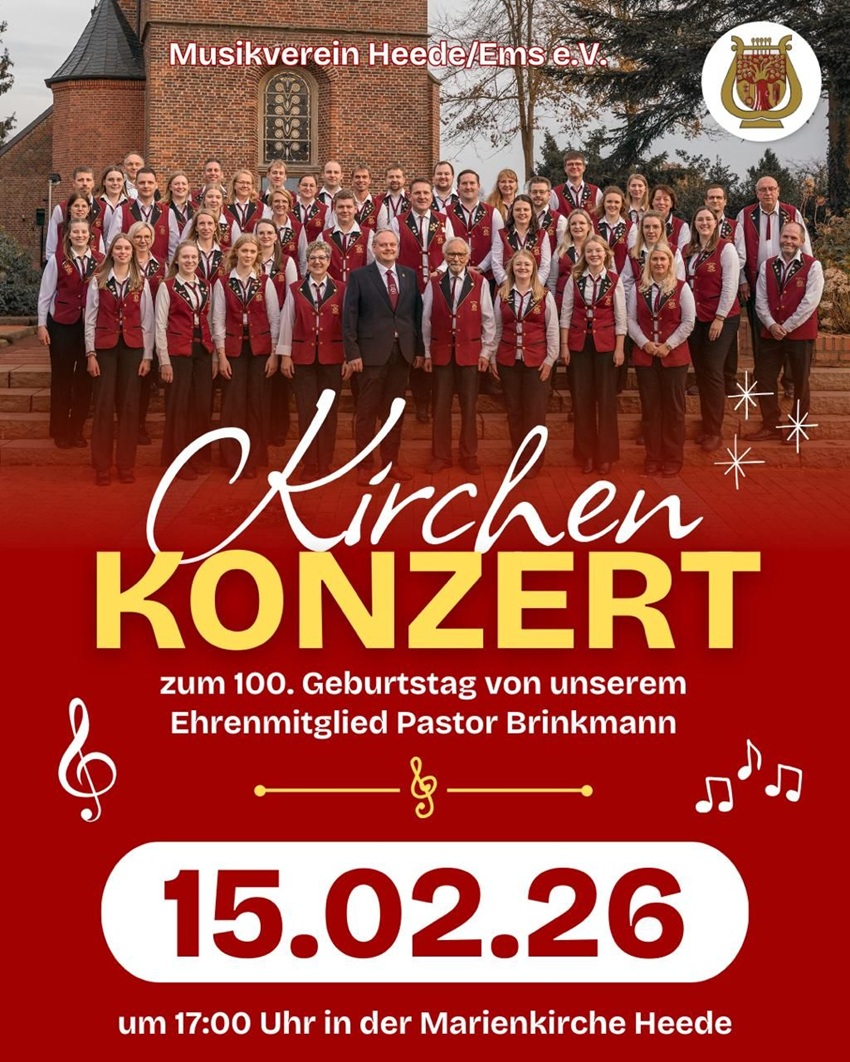 | 15.02.2026 | Musikverein Heede Kirchenkonzert | 17:00:00 | Einladung zum Kirchenkonzert des Musikvereins Heede anlässlich des 100. Geburtstages von Pastor Johannes Brinkmann am 15.02.2026 um 17:00 Uhr in der Marienkirche Heede